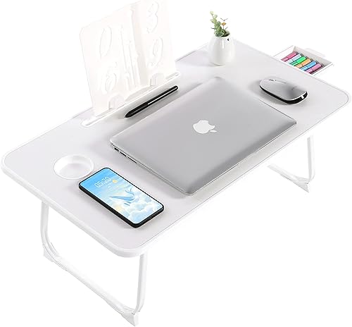 Tamaño grande: con el tamaño de 27.5 pulgadas de largo x 15.7 pulgadas de ancho x 11 pulgadas de alto, se adapta perfectamente a todos los cuadernos de 17 pulgadas o menos, y puede hacer que tus piernas se extiendan fácilmente debajo del escritorio. Movilidad y compactación: patas plegables de metal, esta bandeja de cama para laptop está hecha de tablero de fibra de densidad media que cuenta con resistencia a la humedad, resistencia a los arañazos. Diseño de almacenamiento: la mesa de cama tiene una ranura adicional para soportar tableta o teléfono, y un cajón de almacenamiento para bolígrafos y otras herramientas. El diseño fácil de usar puede satisfacer bien tus necesidades diarias, como leer, estudiar, ver la televisión y comer. No requiere montaje: no es necesario montarlo, ya que viene listo para usar. Evite agacharse y bajar la cabeza para trabajar, de modo que podamos deshacernos de la espalda, cuello, dolor de piernas causado por mucho tiempo durante la postura de trabajo incorrecta.