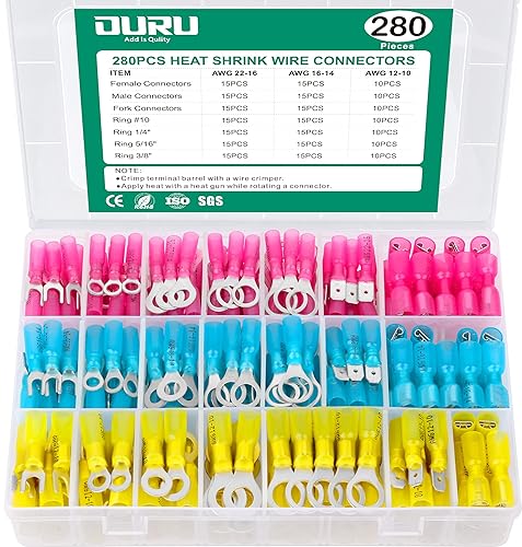 Kit de conectores de cable retráctil térmico de gran variedad: kit de conectores de alambre de buena calidad y organización. Conectores de cable eléctrico de anillo, horquilla y pala termorretráctil. Todo lo que necesitas en un kit. Definitivamente ahorra tiempo. CONECTOR ELÉCTRICO DE GRADO MARINO Resistencia a la sal y a la corrosión. Después del calor, la capa aislante del revestimiento de pegamento se encoge y forma un sello firme. Resiste la prueba del ambiente duro. Cobre rojo chapado en lata mate grueso: protege la capa de cobre del óxido para evitar chispas eléctricas. Excelente conductividad eléctrica. Cumple con todas las normas eléctricas: los conectores termorretráctiles OURU cumplen con las normas ROHS, ISO 9001:2008, SGS y CE. Evite fallas en el cableado y reduzca el tiempo de inactividad del equipo eligiendo conectores eléctricos certificados. Lo que obtienes: nuestra garantía de 24 meses sin preocupaciones y servicio al cliente amigable.