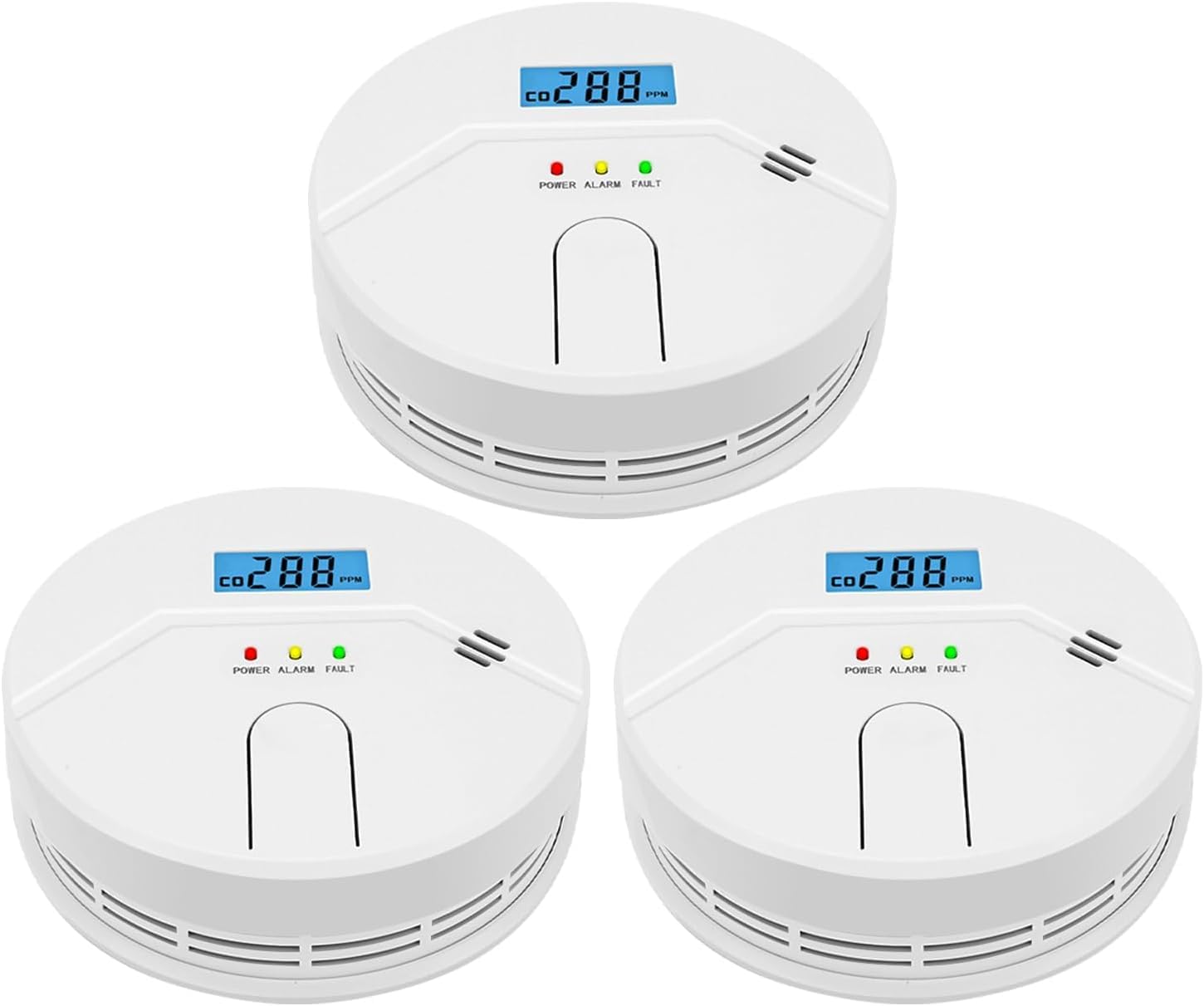 Paquete de 3 detectores de monóxido de carbono, funciona con pilas, alarma de humo y CO 2 en 1 con pantalla digital LCD, detector de monóxido de