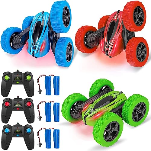Paquete de 3 autos de control remoto, autos de acrobacias RC para niños, 4WD 2.4Ghz de doble cara giratoria de 360° para niños, 6 baterías recargables, azul+verde+rojo duradero RC Stunt Car: el cuerpo está hecho de materiales avanzados y de alta calidad, lo que lo hace resistente y resistente a los golpes. Calidad ecológica premium que hace que sea seguro para los niños. Neumático hueco antideslizante, súper elástico, buen efecto a prueba de golpes, fácil de superar cualquier condición de carretera. Cool Stunt Action: Extreme 360 volteando y girando, doble cara corriendo, adelante, atrás, girar a la izquierda, girar a la derecha. Te da las diferentes experiencias y efectos visuales. Accesible para controlar: Con un control remoto inteligente de 2,4 GHz, fácil de controlar el coche. La distancia de control alcanza los 65.6 ft. Su fuerte potencia del transmisor significa que no hay interferencia de señal si varios jugadores corren contigo simultáneamente. Batería recargable: Estos coches utilizan una batería recargable de 3.7V 400mAh con un cable USB, 15 minutos de tiempo de reproducción y 2 horas de tiempo de carga. El control remoto necesita 2 pilas AA de 1.5 V (no incluidas). El mejor regalo para niños: este auto de control remoto 4x4 es el regalo perfecto de cumpleaños y Navidad para tus hijos. Empaca con 3 coches, y pueden celebrar un partido de carreras