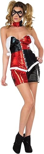 Revisa la tabla de tallas de Delicious Costume antes de seleccionar la talla. El disfraz de Harley Quinn con licencia oficial cuenta con un corsé de cuero sintético rojo metálico y negro con detalles de cuello de bufón de satén blanco adornados con pompones blancos sobre cada taza. El corsé totalmente forrado tiene costuras deshuesadas, copas acolchadas y un tradicional cierre de corsé de metal en la parte central delantera. Cordones de corsé en la parte posterior con ojales de metal y cordones tradicionales de corsé negro; ribete plisado de satén blanco alrededor del dobladillo. La falda a juego está hecha del mismo cuero sintético rojo metálico y negro, con detalles de apliques en forma de diamante en contraste en las caderas, mirando hacia la cintura y una abertura de cremallera ubicada en el centro de la espalda. El collar a juego tiene un cierre de velcro para ajustar. La máscara negra está hecha de lamé elástico con respaldo de espuma con un cierre de velcro elástico. La colección de disfraces Delicious está llena de estilos de moda y diseños amigables con la figura; desde flappers y policías hasta gángsters y diosas, Delicious tiene los estilos coquetos que deseas. Los deliciosos disfraces están diseñados y fabricados con telas y adornos de alta calidad para un ajuste y estilo superiores.