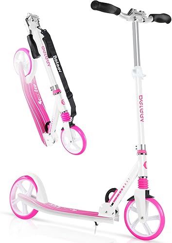Manillar ajustable: El scooter tiene asas anchas que se ajustan a 4 alturas diferentes, según la altura y comodidad del piloto, para que los ciclistas altos no se pierdan la diversión de scooting. Al ajustar las alturas, este scooter puede crecer junto con tus hijos. ¡No tienes que seguir comprando un scooter nuevo cada año! Perfecto para niños, adolescentes y adultos. Una mezcla de seguridad y características cómodas: tenemos en cuenta la seguridad de todos, nuestro scooter te permite navegar con facilidad con su cubierta duradera y resistente soporta ciclistas de hasta 220 libras. Las asas de goma proporcionan comodidad adicional y una sujeción estable. El bloqueo de barra en T ofrece un paseo estable y seguro, no se siente tambaleante incluso en aceras irregulares. Frenos fiables para detener el scooter rápida y fácilmente. Fácil de usar y transportar: el scooter ligero no requiere montaje y está listo para montar directamente fuera de la caja. Todo lo que necesita hacer es desplegar el tubo en T, ajustar la altura en el manillar ajustable, asegurarlo y alejarse. El proceso de plegado es muy fácil y no necesita herramientas. Este scooter es perfecto para empacar en el coche y llevar a cualquier lugar sobre la marcha. Justo lo que estás buscando! Conduce sin esfuerzo: nuestro scooter viene equipado con ruedas extragrandes de PU de alto rebote de 7.874 in, rodamientos ABEC-7 y mecanismo de absorción de impactos que le dan un paseo suave y cómodo en superficies duras e irregulares, por lo que es adecuado para muchos tipos de aceras. Una cubierta antideslizante texturizada que te permite mantener fácilmente tu pie mientras te deslizas de un lugar a otro. Cubierta extra ancha y baja: la cubierta de 4.8 pulgadas de ancho ofrece un buen equilibrio para ti y te ayuda a pisar y bajar fácilmente del scooter. Esta característica le permite cambiar cómodamente su peso o cambiar la posición del pie. La cubierta baja al suelo (solo 1.7 pulgadas) hace que sea más fácil empujar el scooter sin doblar la pierna por la rodilla.