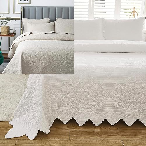 Tamaño King (6 piezas): 1 colcha/colcha de 110 x 98 pulgadas (incluyendo el diseño festoneado) (lo suficientemente grande para cama King y cama Queen con colchón alto), 2 fundas de almohada tamaño King, 1 colcha/colcha de 106 x 96 pulgadas (lo suficientemente grande para cama King y cama Queen con colchón alto), 2 fundas de almohada tamaño King Material: edredón acolchado: tejido 100% algodón. Natural. Ligero, transpirable y suave. BRANDREAM Nuevo diseño: un gran toque de lujo desgastado, lujoso y elegante, simple pero único, delicado y vintage diseño bordado y festoneado hecho a mano. Nos encanta y con todo nuestro corazón deseamos que lo disfrutes también:) Lavar a máquina en frío, ciclo suave, por separado. Se seca rápido en secadora a baja temperatura. El producto de algodón se vuelve más suave después de lavados y usos. Prelavado y preencogido, no se decolora ni encoge Peso y grosor perfectos para todo el año, mantiene funcional y decorativo