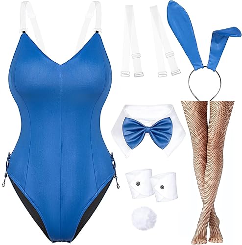 Conjunto de traje de disfraz de conejito para mujer, una sola pieza, con accesorios, Azul Patchwork, L