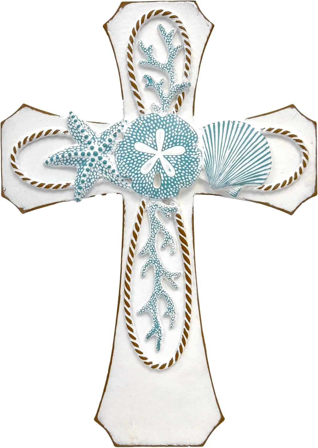 AMAJY Cruz de pared espiritual náutica costera con diseño de estrellas de mar, coral y concha de mar, decoración de casa de playa, arte de pared