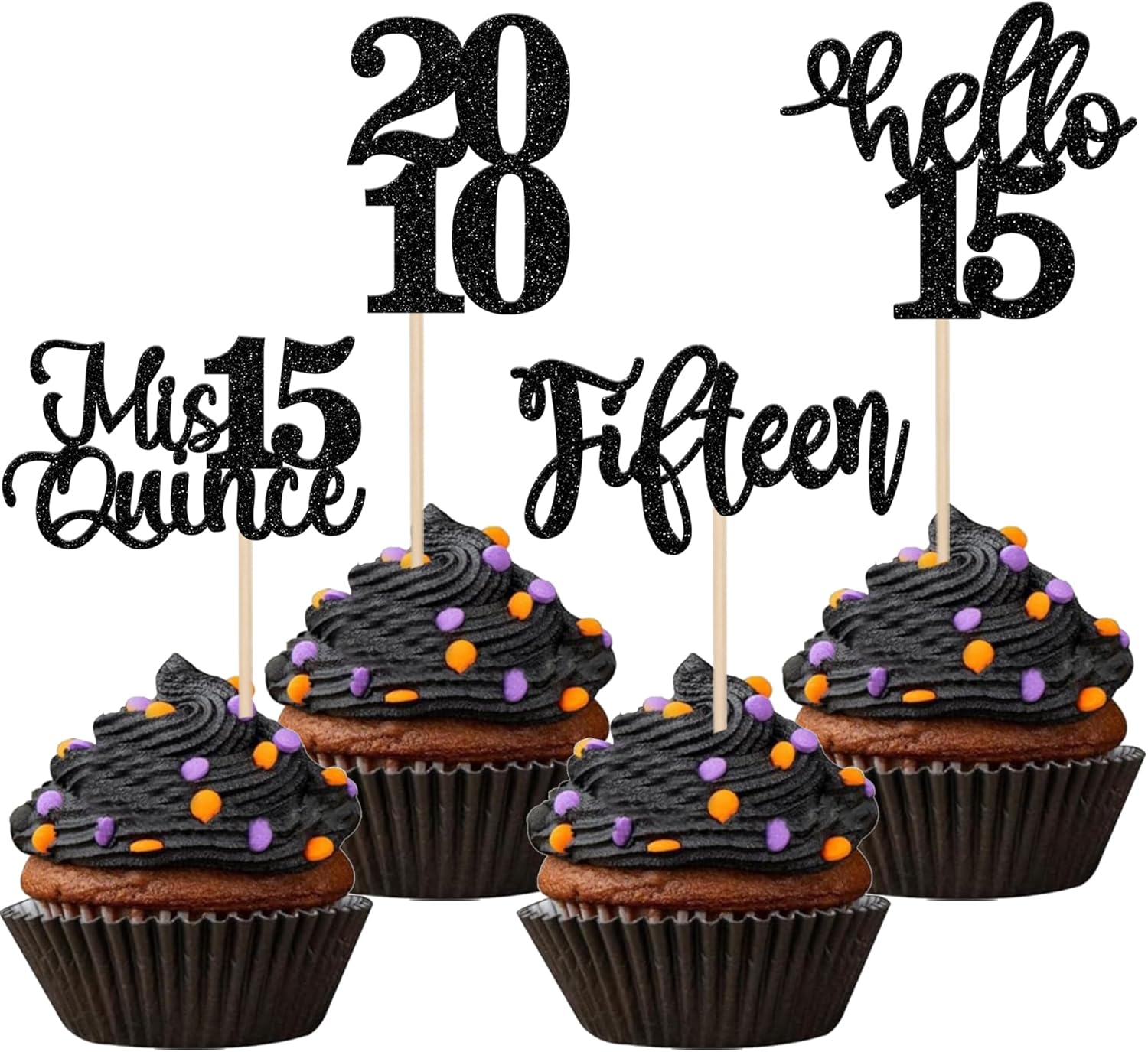 24 piezas de adornos negros para cupcakes de cumpleaños 15 con purpurina Hello 15, decoración para cupcakes Mis Quince Since 2010 para cumpleaños,