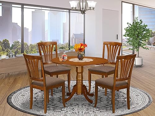 lino tela Este hermoso juego de comedor consta de una hermosa mesa de comedor y 4 excelentes sillas de comedor. Esta silla de comedor de madera brillante tiene 4 patas de madera maciza y un respaldo de listones. Esta mesa de comedor de madera consta de una parte superior redonda, patas de pedestal y dos gotas de 9 pulgadas que aumentarán la gracia de su sala de estar. Puedes crear tu comedor de manera atractiva y obtener un encanto elegante ajustando nuestro juego de comedor de cocina allí. Fantástico juego de mesa de comedor moderno de color marrón sillín que es una razón por la que el moderno juego de comedor combina fácilmente con cualquier decoración de cocina y ofrece a la cocina un aspecto increíble. Hemos pintado este conjunto con la ayuda de colores caros e iramovibles. Nuestro asiento de silla de cocina está fabricado con tela de lino que proporciona una fantástica experiencia de sentado. Su juego de comedor redondo está hecho de madera asiática de primera calidad, también se conoce como madera de caucho. Esta madera ofrece una maravillosa estabilidad y puedes utilizar este moderno juego de mesa de comedor durante mucho tiempo. Es una razón por la que hemos elegido solo madera de primera calidad para que este juego de comedor pueda aumentar la elegancia de tu comedor. Nuestras maravillosas sillas de comedor modernas son cómodas debido al marco de madera de goma, asiento de tela de lino y respaldo de listones. Nuestra silla de comedor proporciona un apoyo completo y una buena experiencia al sentarse. Nuestra mesa de hojas colgantes es muy útil para ti porque puedes dejar caer los lados de la mesa cuando no lo necesites y levantarlos cuando lo necesites. Las medidas de la hermosa mesa de comedor moderna son: longitud: 42, ancho: 42, altura: 29. Las dimensiones de las maravillosas sillas de madera son: Ancho 22; Profundidad 18; Altura 36