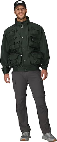 La chaqueta Sportsman Pack cuenta con una construcción con tecnología DriPore Gen 2 que mantiene a los usuarios secos y cómodos Costuras impermeables totalmente selladas y cremallera frontal resistente con solapa para tormentas que mantienen la humedad fuera Puños elásticos ajustables en la muñeca y cordón ajustable en la cintura que garantizan el ajuste perfecto Capucha totalmente ajustable con pico extendido 18 bolsillos dentro y fuera y soporte de caña plegable hacen que la chaqueta sea perfecta para un largo día de pesca 2 anillos en D accesorios en el pecho