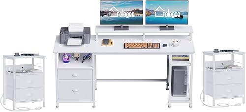 Furologee 61" Computer Desk and Nightstands Set of 2, Office Desk with File Cabinet & Drawer, End Tables with Charging Station, for Home/Office