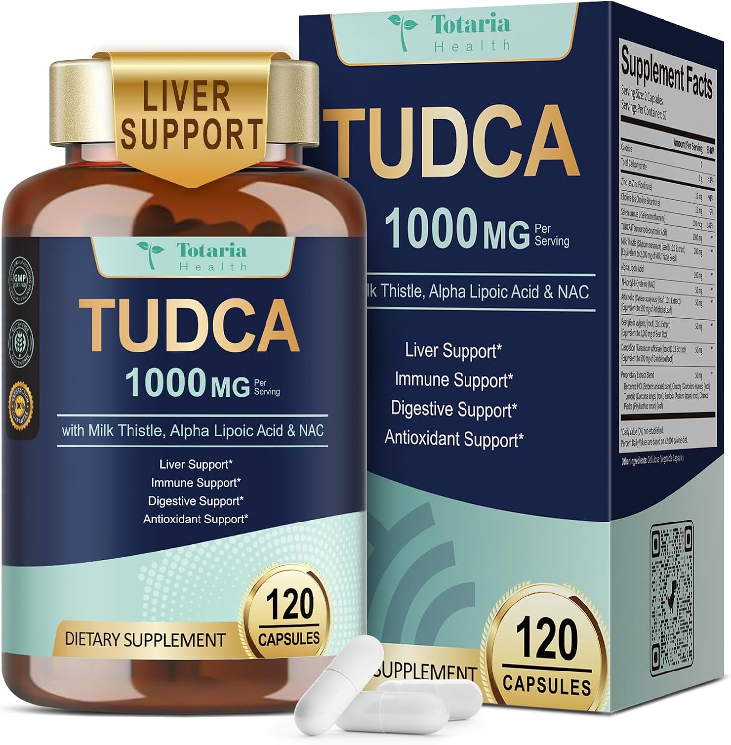 Totaria TUDCA Suplemento de apoyo hepático de 1000 mg con cardo mariano, NAC, ALA, 80% de silimarina, sales biliares extra fuertes 15 en 1, para
