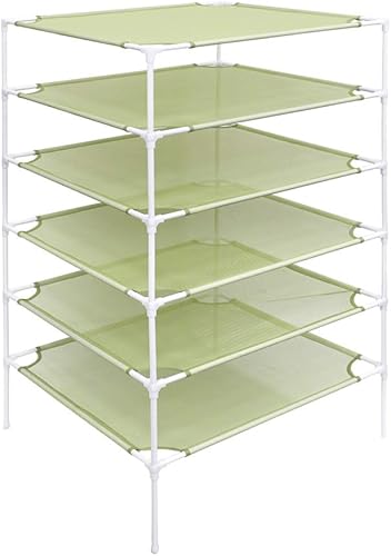 Tamaño del producto: una capa: 28x28x 8 pulgadas, total 6 capas: 28x28x48 pulgadas Material del producto: con el poste de metal para garantizar que el estante seco sea estable. La superficie recubierta para evitar que el poste de metal se oxide, no raya ni mancha la ropa. La malla se estira firmemente en el estante, se retira del estante para limpiarlo cuando sea necesario. Secado rápido: tela de malla duradera para agregar flujo de aire, malla de malla para un flujo de aire uniforme y secado rápido. Reducir el tiempo de Diseño desmontable: diseño apilable para ahorrar espacio y secado eficiente. Ensamble capas según sea necesario. Fácil instalación: se monta rápidamente sin necesidad de herramientas.