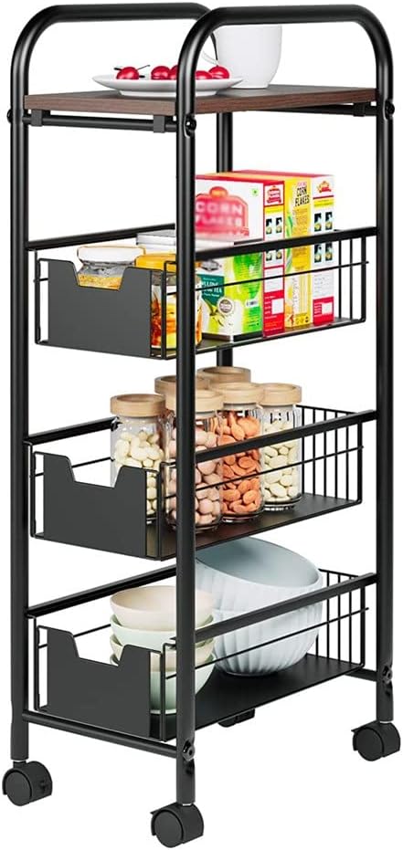 Diseño estrecho: este carrito de almacenamiento delgado de 23.5 pulgadas de ancho x 15 pulgadas de profundidad puede caber fácilmente en espacios reducidos alrededor de tu hogar. Añade un toque de estilo industrial a tu espacio y complementa la decoración de tu hogar con este carrito de microondas., Dos cestas extraíbles: el carrito con ruedas tiene un mostrador abierto y dos cestas extraíbles para un fácil acceso a utensilios de cocina, artículos de tocador, maquillaje, libros y más. La cesta de alambre permite que el aire circule, por lo que es adecuado para almacenar verduras, frutas y ropa de cama doblada también., Ganchos laterales prácticos: Cuatro ganchos laterales que se pueden utilizar a ambos lados del carrito con almacenamiento brindan una solución de almacenamiento conveniente y ordenada para limpiar paños, tazas, guantes de horno, etc., Fácil movilidad: este pequeño carrito de cocina incluye cuatro ruedas giratorias de 360°, para que puedas mover rápidamente el carrito de café de la cocina al comedor. Las ruedas tienen frenos para mantener el carro rodante en su lugar., Carrito de cocina con cestas de almacenamiento Dimensiones: 23.5 pulgadas de ancho x 15 pulgadas de profundidad x 33.75 pulgadas de alto, capacidad de peso: 33 libras (total), 11 libras (cada estante). Requiere montaje.