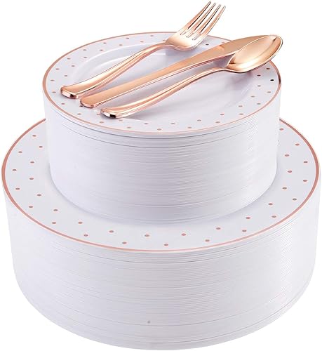 Seguro y resistente: nuestros platos de fiesta de oro rosa son seguros, libres de BPA y están hechos de materiales de calidad. Resistente y duradero, no se dobla bajo el peso de alimentos pesados. El paquete incluye: 200 piezas de vajilla de oro rosa con puntos incluye: 40 platos llanos, 40 platos de ensalada, 40 tenedores, 40 cuchillos, 40 cucharas. Ideal para 40 invitados.Disponible para todo tipo de alimentos.Satisface todas las necesidades de las actividades de fiesta! Diseño de moda: impresiona a tus invitados y deja que los platos de plástico sean el centro de atención de cualquier mesa moderna y moderna. Ideal para el Día de la Madre. Diseñados para todas las ocasiones: nuestros cubiertos de plástico de oro rosa con platos son ideales para bodas, compromisos, cumpleaños, fiestas, cenas en casa y cualquier otra ocasión. Pueden transformar una mesa simple en uno elegante. Fiesta sin la limpieza: ¿No esperas la molestia de limpiar después de tu cena? Los platos desechables de oro rosa para 40 invitados con utensilios te ayudan a pasar menos tiempo en la cocina y más tiempo divirtiéndote con tus amigos y familiares