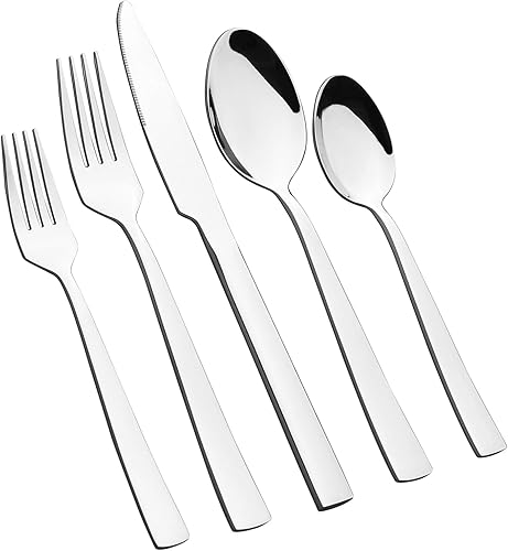 Fabricado con acero inoxidable de alta calidad, es resistente, duradero, resistente a la corrosión y fácil de limpiar y mantener Juego completo: incluye 80 piezas, incluyendo 16 tenedores de postre, 16 tenedores de comedor, 16 cuchillos, 16 cucharas y 16 cucharas de postre, para satisfacer las necesidades de las reuniones familiares El diseño del tamaño de la vajilla es considerado, con un tenedor de postre de 7 pulgadas, un tenedor de 8.14 pulgadas, un cuchillo de 8.93 pulgadas, una cuchara de 8.18 pulgadas y una cuchara de postre de 6.69 pulgadas, por lo que es conveniente y cómodo de usar Ideal para uso diario en familia Diseño simple pero elegante, adecuado para varias decoraciones de mesa, mejorando el ambiente y el sabor del comedor