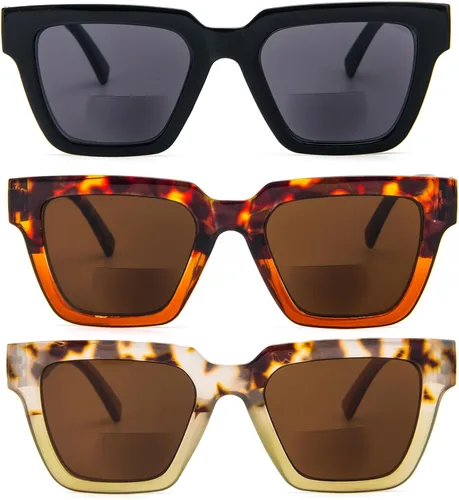 KoKoBin Paquete de 3 lentes de sol de lectura bifocales estilo Oprah para mujer, marco cuadrado de gran tamaño, cómodos lectores (multicolor 2)