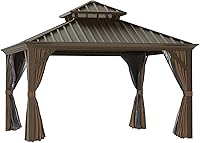 Dark brown colored rustproof aluminum frame, which is very strong and sturdy, built with 4.7“x4.7" triangular aluminum stand pole,much bigger and stronger than standard models. All materials are built to last, never becoming rusty or deformed. Hard metal top instead of normal fabric or polycarbonate material. Extremely durable PBV-coated polyester mosquito netting and removable steel railing on 4 sides. Double Track System allows you to add another layer of privacy sidewall. Include 2 layers sidewalls (mosquito set and strong 180gsm polyester solid sidewall) Better ventilated than one layer design. Galvanized steel roof strong enough to withhold heavy snow. Better water gutter design to ensure rainwater always goes to the corner