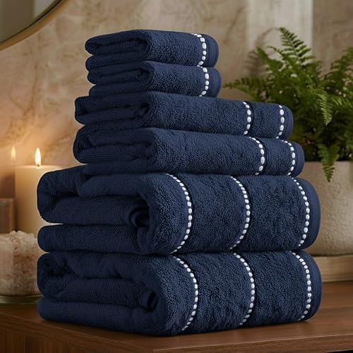 100 % Algodón Importado Juego de toallas de baño de 6 piezas: este juego de toallas de baño viene con 2 toallas, 2 toallas de mano de baño y 2 paños con un atractivo borde de cuentas de puntada de alfiler. Utiliza las toallas de baño en tu baño principal, de invitados, en suite o dormitorio. Suave y absorbente: cada toalla de baño está hecha de 100% algodón, con un grosor de felpa de 525 GSM que es suave al tacto y proporciona mucha calidez, mientras que los extremos sin torsión permiten una mayor absorción y una mayor durabilidad para un uso duradero. Secado rápido: cuenta con las toallas de baño de lujo para un diseño ligero con comodidad de secado rápido que se verá genial en cualquier baño. Las toallas de baño de algodón absorben fácilmente la humedad y son de secado rápido para su uso en tu baño o baño. Lavable a máquina: toallas de ducha en casa para una limpieza cómoda. Espere un poco de pelusa durante el primer lavado; esto es normal. Lavar por separado antes del primer uso y de otras ropas/toallas. Simplemente lava a máquina el juego de toallas en caliente con colores similares, no usar blanqueador, luego secar en secadora a baja temperatura para un fácil cuidado. Detalles del producto: Materiales: 525 GSM 100% algodón. Dimensiones: Toalla de baño: 54 pulgadas de largo x 27 pulgadas de ancho. Toalla de mano: 28 pulgadas de largo x 16 pulgadas de ancho. Paño de baño: (L) 12 pulgadas x (ancho) 12 pulgadas. Incluye 2 toallas de baño, 2 toallas de mano y 2 toallitas. Color: azul marino con borde blanco.