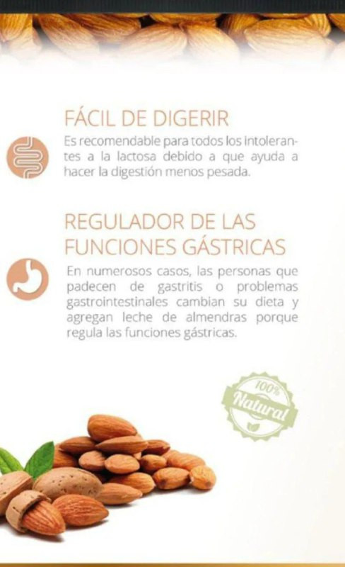 REGULADOR DE LAS FUNCIONES GÁSTRICAS: En numerosos casos, las personas que padecen de gastritis o problemas gastrointestinales cambian su dieta y agregan leche de almendras porque regula las funciones gástricas.