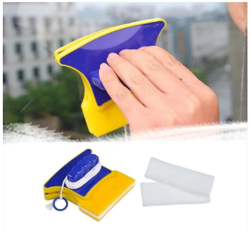 -El cepillo limpiador Imantado Magnético traer una esponja para limpiar (jabón), una pequeña haragán para secar los líquidos (agua) y Una fuerte Imán Magnético que lo mantiene unido ambos cepillo limpiador en el Vidrio, pegado fuertemente al vidrios, lo cual Limpiando ambos lado de vidrios de ventana o los vidrios de Vitrina exhibidora de su Negocio (lado de afuera y adentro)