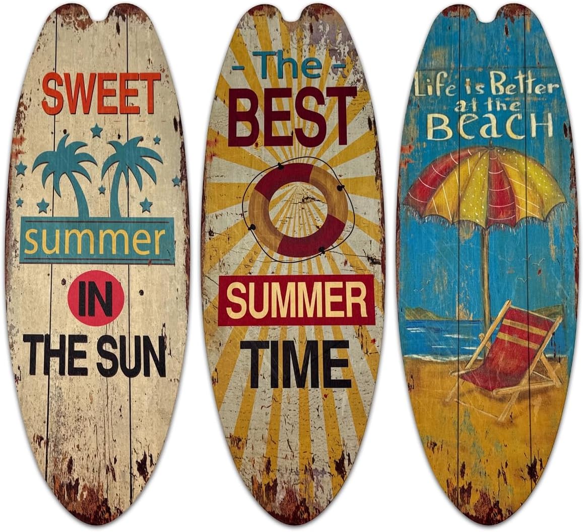 3 Set Wooden Surfboard Wall Hanging Decor, 17.7 Inch Surfboard Beach Wall Art, Hawaiian Coastal Plaques for Living Room, Entryway, Bar Decor