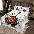 Manfei Colcha de guitarra para niños, tamaño individual, diseño retro de vinilo con notas musicales, alas de ángel, decoración de habitación de