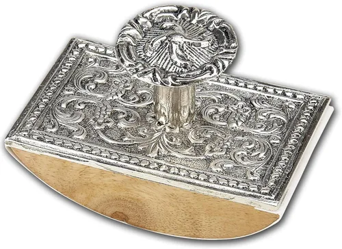 Blotter de tinta mecedora de madera tradicional con trabajo de metal plateado Imprescindible para cualquier persona que escriba con tinta o practique caligrafía 3.0 in de largo, 1.5 in de ancho. Trabajo de pergamino de metal de estilo vintage, viene con 2 hojas de recambio de secante Simplemente balancea el secante sobre la tinta húmeda y el bloc de papel absorberá el exceso de tinta, no más esperas a que la tinta se seque. 5 hojas de repuesto incluidas