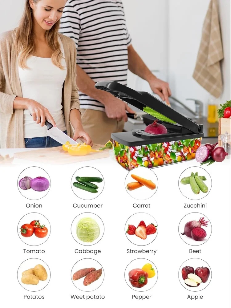 Estable y espacioso: diseñado con una base antideslizante, nuestro cortador de verduras se mantiene anclado a tu encimera para un funcionamiento perfecto. El recipiente ampliado es perfecto para una preparación sin problemas y un almacenamiento conveniente, incluyendo una cesta de drenaje para enjuagar y mantener los productos, asegurando que todo lo que necesitas esté al alcance de la mano.