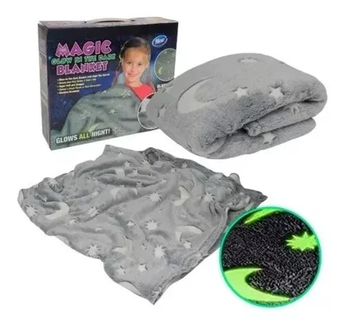 Las estrellas brillantes en esta manta de felpa brillarán por la noche después de ser colocadas por una fuente de luz directa durante al menos 30 minutos.