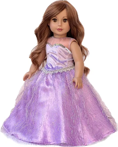 Romántico vestido de lavanda/morado hecho de satén, malla, terciopelo y cintas plateadas. Diseñado en los Estados Unidos para adaptarse a las populares muñecas de 18 pulgadas. CERTIFICACIÓN DE SEGURIDAD DE PRODUCTOS PARA NIÑOS CPSIA DE EE. UU MUÑECAS NO INCLUIDAS