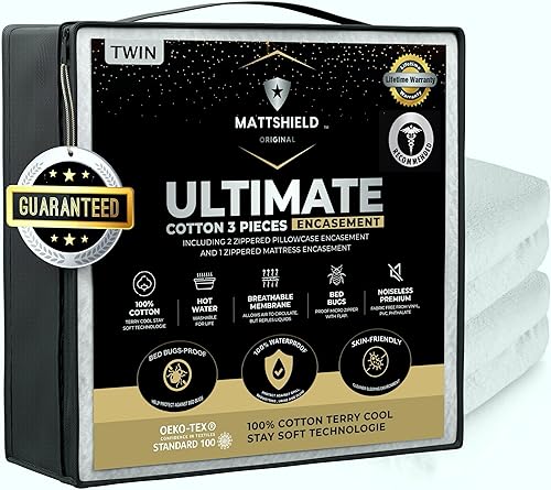 🔳 KIT ULTIMO PARA PROTECCIÓN DE CAMA: Juego de protección contra chinches Mattshield Ultimate de 3 piezas - Tamaño Twin (96.5 X 188.0 cm o 38" X 75"), incluye funda para colchón y 2 fundas para almohadas con cierre. Superficie de algodón suave y 100% impermeable para una protección del colchón de por vida. 🔳A PRUEBA DE CHINCHES DE CAMA Y AMIGABLE CON LA PIEL: Descansa tranquilo con nuestro protector de colchón con cremallera amigable con la piel, diseñado para ser a prueba de chinches de cama. Se adapta a colchones de hasta 18 pulgadas de grosor, proporcionando una protección segura para muchas camas. 🔳 TELA DE ALGODÓN DE RIZO REFRESCANTE: Disfruta del tacto suave de la superficie de tela de 100% algodón de rizo, asegurando un sueño cómodo mientras mantiene tu colchón limpio y protegido. Material transpirable para regular la temperatura. 🔳 100% IMPERMEABLE EN 6 LADOS: Nuestro protector de colchón a prueba de chinches de tamaño Twin con cremallera cuenta con una capa impermeable de 6 lados, protegiendo tu colchón de derrames y manchas para mantenerlo en óptimas condiciones. Ideal para esos accidentes inesperados. CUIDADO FÁCIL: Lavable a máquina para un cuidado sin esfuerzo, simplemente mételo en la lavadora para mantenerlo fresco. Diseño de bolsillo profundo para un ajuste fácil y perfecto, con una cubierta premium de seis lados con cremallera para mayor seguridad. 🔳 GARANTÍA DE POR VIDA: Confía en Mattshield, tu satisfacción es nuestra prioridad. Experimenta la diferencia de Mattshield y invierte en un sueño de calidad sin preocupaciones. Diseñado para su uso debajo de las sábanas: como todos los protectores de colchón premium, el nuestro está diseñado para ser utilizado debajo de tu sábana bajera. Esto garantiza una comodidad óptima al tiempo que preserva el rendimiento impermeable y protector.