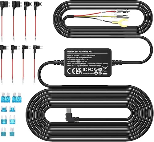 Pelsee Kit de cable rígido para cámara de salpicadero, kit completo de cable duro tipo C, fusible de cable de 12V-24V a 5V para cámara de tablero de