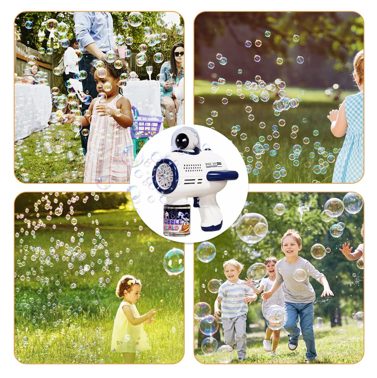 El maquina pompas jabón está hecho de material ABS de alta calidad, no irritante, a prueba de olores, seguro y no tóxico. Aspecto redondeado y hermoso, mango ergonómico para un agarre cómodo y suaves esquinas redondeadas en todas partes para proteger las delicadas manitas de su hijo.