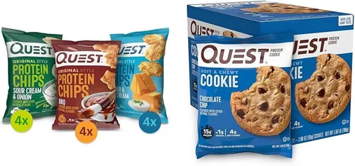 Producto 1: PAQUETE VARIEDAD QUEST PROTEIN CHIPS. Todos tus gustos favoritos en un gran lugar. Disfruta de los sabores clásicos de barbacoa, crema agria y cebolla, y crema agria y quedar, todo en un solo paquete. Producto 1: DISFRUTA MÁS. Menos carbohidratos. Los chips de proteína horneados Quest proporcionan todo el sabor crujiente y satisfactorio de una patata frita normal, pero las nuestras tienen 0.67 oz de proteína y 0.14 oz de carbohidratos netos por porción. Producto 1: SALADO, SALADO, CRUZADO. Un chip crujiente que ha sido sazonado a la perfección. Producto 1: CHIPS QUE VIAJAN CON USTED. Llévalos contigo en tu mochila, bolso, consola de coche, bolsa de gimnasio o donde tus aventuras te lleven. Producto 2: TE MERECES UNA GALLETA: Las galletas de proteína Quest Chocolate Chip te proporcionan una galleta dulce, suave y masticable con 0.53 oz de proteína, 0.14 oz de carbohidratos netos y menos de 0.04 oz de azúcar Producto 2: DESENVUELVE PROTEÍNAS COMPLETAS: Las galletas de proteína Quest Chocolate Chip están hechas con proteínas completas a base de lácteos para proporcionarte 9 aminoácidos esenciales Producto 2: LA FIBRA ES TU AMIGA: Las galletas de proteína Quest Chocolate Chip tienen 0.32 oz de fibra para proporcionar a tu cuerpo un perfil macro más completo. Estado de preparación: Listo para comer Producto 2: DULCE SIN TODO EL AZÚCAR: Disfruta del sabor dulce de una galleta con chispas de chocolate con menos de 0.04 oz de azúcar
