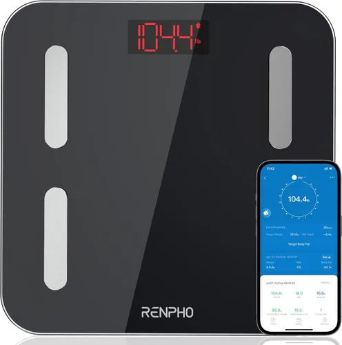 Báscula de alta precisión: la báscula de grasa corporal inteligente está equipada con 4 sensores en forma de G de calibración automática que proporcionan resultados en incrementos de 0.1 lb / 0.05 kg con una capacidad máxima de 396 lb / 180 kg. Plataforma de vidrio templado de 0.197 in, 3 pilas AAA incluidas. Análisis de la composición corporal completa: mide 13 índices clave de salud corporal, como peso, IMC, grasa corporal, grasa visceral, masa muscular, masa ósea y más para rastrear los objetivos de su cuerpo. La aplicación le ofrece un informe de medición detallado después de pesar cada vez. Sincronizar con la aplicación de fitness: descargue la aplicación "Renpho Health" en la App Store o Google Play. Puede exportar datos en CSV para profundizar aún más en sus datos. Funciona con Myfitnesspal, Samsung Health, Apple Health, Fitbit y Google Fitness. Una escala para usuarios ilimitados: rastrea las tendencias de salud de usuarios ilimitados en la aplicación Renpho Health. Le permite a usted y a su familia compartir una escala juntos. La aplicación es compatible con el modo de pesaje para bebés que puede registrar y rastrear el peso de niños y mascotas. Fácil de usar: habilita Bluetooth en tu teléfono y abre la aplicación, luego pisa descalzo para obtener todos los datos de composición corporal. Puedes pesarte en cualquier momento sin tu teléfono. Los datos se sincronizarán con la aplicación una vez que esté conectada nuevamente.