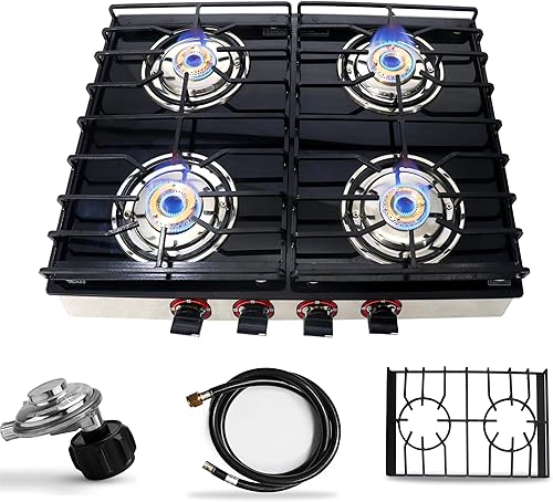 [EFFICIENT COOKING] Heat two pots and pans simultaneously with the dual burner design, saving you time in the kitchen. [MULTI STAGE FIRE ADJUSTMENT] Two independent knob controls allow you to adjust the flame to suit different ingredients, helping you create delicious meals. [ENHANCED SAFETY] Equipped with a battery box for pulse ignition, electronic ignition, and flameout system for safe and reliable cooking. [WIDE APPLICATIONS] Perfect for RVs, campers, yachts, and more. Can be recessed installed for a flush tabletop appearance (check countertop strength). [DURABLE AND EASY TO CLEAN] Made with a tempered glass panel and stainless steel base, this gas stove is built to last and easy to wipe clean.