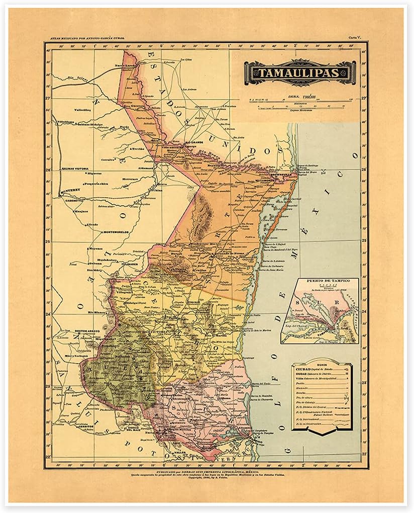 Antiguos Maps Estado Libre y Soberano de Tamaulipas del Atlas Mexicano circa 1884 | Póster decorativo vintage para pared, 24 x 30 pulgadas (24.016 x