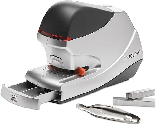 Asegura 45 hojas: la longitud de la pata de la grapa de 3/8 pulgadas es ideal para trabajos más grandes. Para reducir el riesgo de atascos, utiliza la grapadora Optima 45 exclusivamente con grapas de alta capacidad Swingline Optima (S7035550). Práctica carga rápida: práctica función de carga rápida para recargas fáciles. El cargador de grapas frontales se expulsa con solo presionar un botón. El indicador de grapas bajas te avisa cuando es el momento de un relleno Colocación precisa de grapas: la guía de alineación inteligente de papel integrada y el medidor de altura de la pila ayudan a garantizar una colocación precisa de las grapas y el recuento de hojas Paquete económico: práctico paquete que incluye grapadora eléctrica Optima 45, grapas Optima de alta capacidad y un removedor de grapas, hoja de metal retráctil en el removedor que permite una extracción sin estrés Limpio y organizado: el cajón de almacenamiento fácil de abrir con un solo toque en la base de la grapadora mantiene las grapas de repuesto a mano. El removedor recoge fácilmente las grapas desechadas para mantener el espacio de trabajo limpio