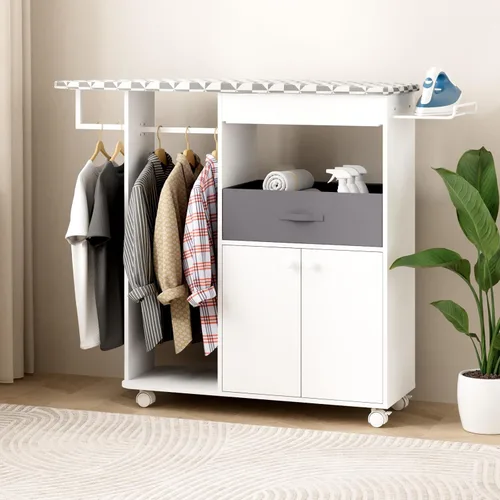 Tabla de planchar todo en uno con almacenamiento: esta tabla de planchar multifuncional con armario de almacenamiento integra una superficie de planchado, estante de soporte de hierro, barras de ropa, bandeja extraíble y múltiples compartimentos de almacenamiento en una unidad, manteniendo todos sus elementos esenciales de planchado organizados en un solo lugar Amplio almacenamiento: el gabinete de tabla de planchar cuenta con estantes abiertos, un gabinete cerrado y una bandeja extraíble suave, proporcionando un espacio generoso para almacenar su plancha, vaporizador, perchas, aerosoles y otros accesorios de lavandería perfectamente Fácil de mover: equipada con ruedas bloqueables de rodamiento suave, esta mesa de planchar se puede mover fácilmente donde la necesite y se bloquea de forma segura en su lugar durante el uso Construcción duradera y resistente al calor: hecha de madera MDF resistente, esta tabla de planchar con almacenamiento cuenta con una cubierta resistente al calor que garantiza una durabilidad duradera y una experiencia de planchado suave Estilo moderno para cualquier habitación: con su elegante acabado blanco, este gabinete de tabla de planchar complementa la decoración moderna y se adapta perfectamente a lavanderías, dormitorios o espacios de manualidades, combinando funcionalidad y estilo Fácil de montar: este armario para tabla de planchar es fácil de montar y viene con un kit completo de herramientas y todas las herramientas de instalación necesarias. También puedes elegir entre tres elegantes fundas de tabla de planchar resistentes al calor para que coincida con tu gusto personal y decoración del hogar