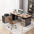 Escritorio ejecutivo en forma de L con cajones de archivos y gabinete de almacenamiento, escritorio de esquina para computadora con tomas de