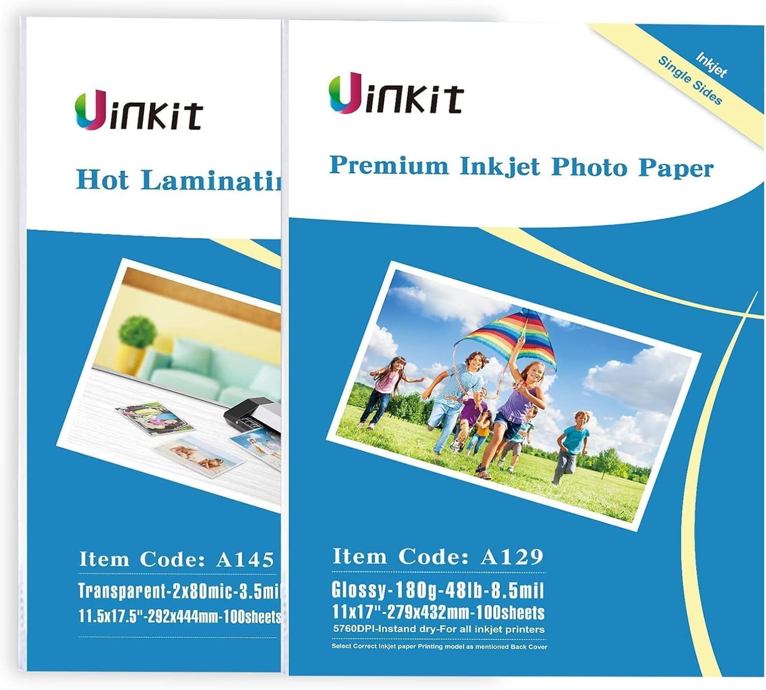 Uinkit 100 hojas de papel fotográfico brillante 11x17 solo lado+100 hojas de laminación 3mil hojas 11.5x17.5inche bolsas de laminación Producto