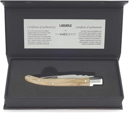 Cuchillo plegable de bolsillo contemporáneo de nuestra colección TopKnife, basado en el diseño francés de Laguiole, que puedes usar como cuchillo diario y también para cortar tu bistec con estilo en cualquier lugar, incluso en tu restaurante de barbacoa favorito. También es útil para muchas tareas pequeñas en tu rutina diaria, campamento y al aire libre. Lo suficientemente pequeño como para guardar en tu bolsillo o guantera. El cuchillo tiene una longitud total de 7-5/8 pulgadas cuando está abierto y 4-3/8 pulgadas cuando está plegado. La hoja tiene 3-1/2" de longitud, está hecha de acero inoxidable AISI 440 de alto carbono (0.95% carbono, 16% cromo) y es 3/32" de espesor (0.098 in). La dureza es 56-59 RC que asegura una nitidez duradera. El mango está hecho de madera de arce con un elegante acabado mate. Refuerzo frontal con el famoso diseño de abeja, y tres remaches están hechos de acero inoxidable. Se recomienda lavar a mano y secar. Garantía limitada del fabricante de por vida. Diseñado en Francia y fabricado en China.