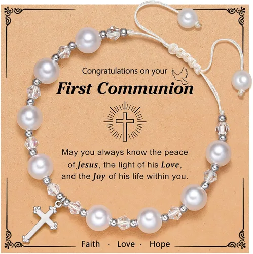 【Pulsera de primera comunión】Bonita pulsera de perlas combinada con dije de cruz que le hace saber que siempre está conectada a Dios. Cuando lleve esta pulsera tendrá un recordatorio de su fuerza y Dios siempre estará con ella. Regalos de primera comunión para niñas: la bonita pulsera viene con una tarjeta de cita significativa en una hermosa bolsa de joyería. Un regalo perfecto para hija/nieta/sobrina/ahijada o cualquier niña en su primer día de comunión. Material: hecho de perlas blancas y dije de cruz de acero inoxidable, que llama la atención de las niñas. La pulsera es hipoalergénica y ligera y es el accesorio más lindo que a todas las niñas les encantará Tamaño adecuado: nuestra pulsera viene con un cierre de nudo deslizante que se puede ajustar de 5.2 a 9 pulgadas, se adapta a la mayoría de muñecas, no tienes que preocuparte por el tamaño. 【Desencadéntalos】 -- Tu felicidad es nuestra felicidad. No dudes en ponerte en contacto con nosotros si tienes algún problema con nuestros productos. Nos aseguraremos de responderte en 24 horas y darte las soluciones. Comprueba las imágenes de la descripción del tamaño antes de realizar el pedido.