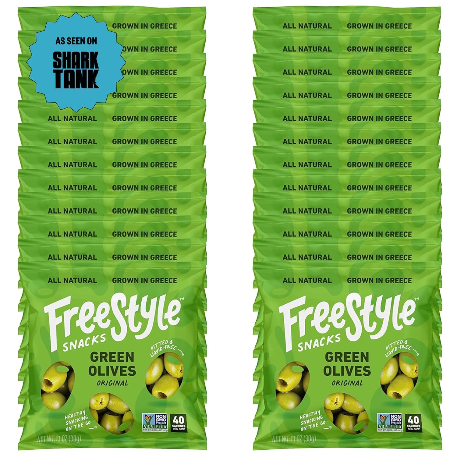 Freestyle Snacks Paquetes de Aperitivos de Aceitunas – Porción Individual – Aceitunas Verdes Frescas Deshuesadas, Tamaño Jumbo, Cultivadas en