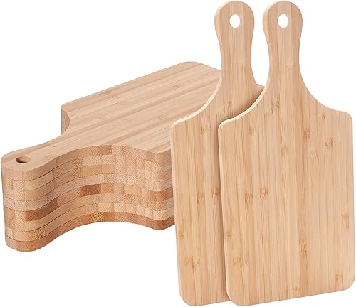 Material de alta calidad: nuestras tablas de cortar de madera para cocina están hechas de bambú de alta calidad, que es ligero, resistente y duradero. La superficie de la tabla de cortar carne está cubierta con una capa de aceite para evitar la corrosión. No hay pinturas ni astillas de madera en la mini tabla de cortar, no hay necesidad de preocuparse de que la comida esté contaminada. Uso práctico: el juego de 10 tablas de cortar cumple con varias demandas de uso y se puede clasificar en platos de desayuno, tablas de charcutería, bandejas de frutas, tablas de cortar de carne o verduras, etc. También puedes tallar diferentes patrones en cada pequeña tabla de cortar para decorar y distinguir. Las tablas de cortar de madera con mango son cómodas de recoger y hay un agujero en el mango para colgar en el gancho, ahorrando espacio para la cocina. Fácil de limpiar: no es necesario remojar la tabla de queso en el fregadero o ponerla en el lavavajillas después de su uso. Solo lávelas con agua y séquelas con un paño de cocina, y la limpieza de la tabla de cortar de madera estará terminada. Cubra la superficie de la tabla de cortar de cocina con una capa de aceite o colóquelas en seco para mantener las tablas y obtener un uso más prolongado. 【Dimensiones】Cada tabla de cortar de bambú tiene una tabla de 7" x 5" y un mango de 3.9". El grosor de la tabla de servir es de 0.3 pulgadas. Amplia aplicación: estas tablas de cortar de madera son adecuadas para cortar frutas, verduras, carnes y otros alimentos. También son bandejas ideales para servir pan, galletas, donas, pasteles, pizza, queso, sándwich, etc. Además, la tabla de cortar de madera sería un gran regalo para una fiesta de inauguración de la casa.