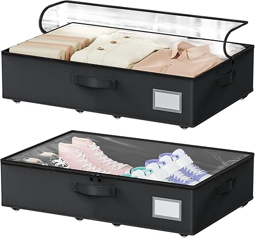 Maximiza el espacio: maximiza tu espacio de almacenamiento con este recipiente de almacenamiento de metal debajo de la cama con ruedas. te permite almacenar artículos lejos de la vista sin ocupar espacio en el piso. Dimensiones: 23.62 pulgadas de largo x 16.54 pulgadas de ancho x 5.51 pulgadas de alto (sin ruedas)/7.3 pulgadas de alto (con ruedas). Perfecto para dormitorios y apartamentos pequeños. Los contenedores de almacenamiento debajo de la cama se utilizan debajo de las camas, en armarios, en estantes o debajo del sofá. Una buena opción para dormitorio, dormitorio, sótano y mucho más Resistente y duradero: nuestro almacenamiento debajo de la cama con ruedas está hecho de bambú de madera de primera calidad, con 4 ruedas giratorias y una capacidad de 120 libras. Esta solución de almacenamiento debajo de la cama incluye bolsas no tejidas para una organización eficiente de ropa, libros, zapatos y juguetes. Ruedas giratorias de 360°: estos contenedores de almacenamiento debajo de la cama están equipados con ruedas de goma que giran 360°, lo que permite un movimiento suave y sin esfuerzo tanto en suelos de madera como en alfombras, sin causar daños. Dos de las ruedas tienen una función de bloqueo. Cuando el almacenamiento debajo de la cama necesite permanecer quieto, simplemente presione el interruptor de bloqueo. Bolsas de polvo de gran capacidad de alta calidad: hecha de tela de PVC superior, transpirable e inodora, nuestra bolsa de almacenamiento debajo de la cama ofrece una protección sin igual contra el polvo y la humedad. Versátil en uso, se puede fijar al estante con velcro. Con una ventana transparente, simplifica el proceso de identificación de artículos almacenados Multiusos: desde ropa y zapatos fuera de temporada, hasta libros, decoraciones de juguetes y otros artículos, estos contenedores de almacenamiento debajo de la cama pueden manejar todo tipo de necesidades de almacenamiento. El cajón debajo de la cama se puede colocar en el dormitorio, sala de estudio, sala de estar, lavandería, lavadero o incluso en el pasillo. Añade elegancia a cualquier habitación y es ideal para el almacenamiento en casa.