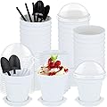 Honeydak Paquete de 50 tazas de plástico para tartas de postre con tapa, pala, cuchara, bandeja inferior, tazas de postre, helado, yogur, Blanco