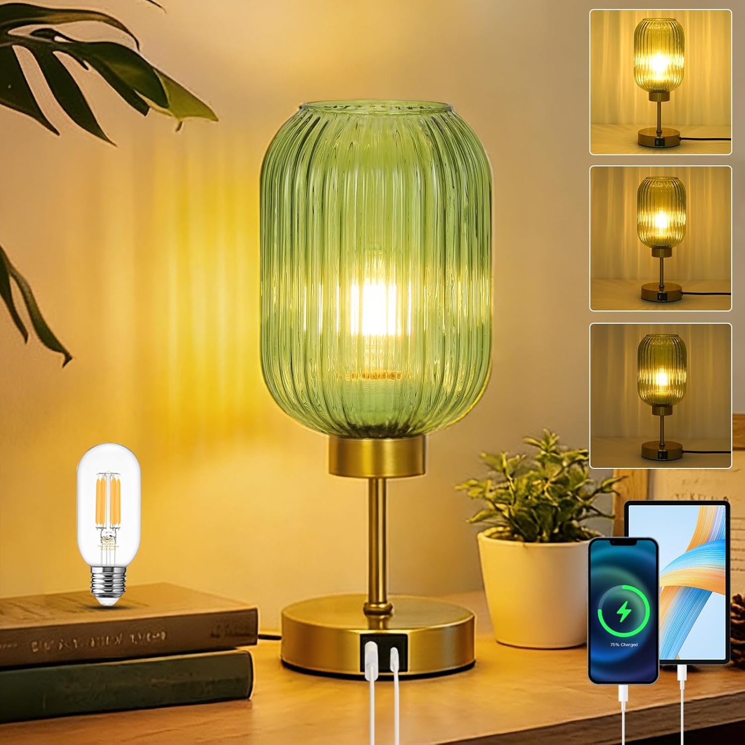 Lámpara de mesa vintage para dormitorio con bombilla, pequeña lámpara de cristal verde con puertos USB, lámpara de escritorio dorada regulable de 3