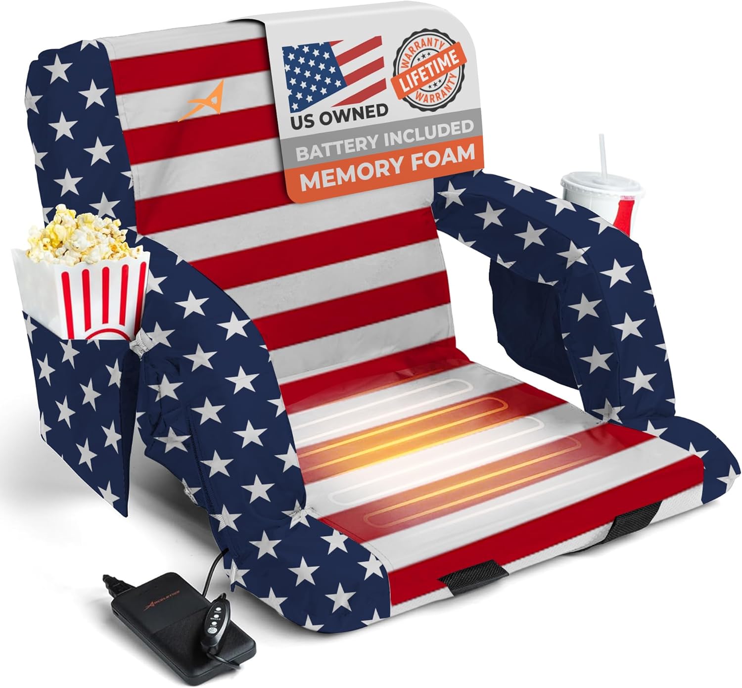 Asientos de estadio con calefacción para gradas con respaldo – Batería USB incluida – 3 niveles de calor mejorados – Silla plegable – 4 bolsillos